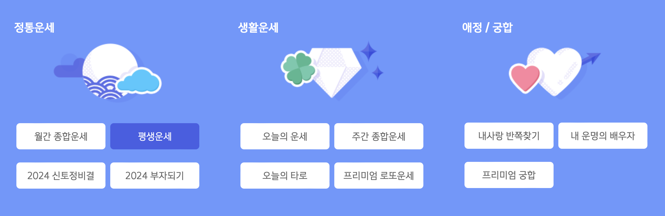 또한 애정/궁합에서는 내 사랑 반쪽 찾기, 내 운명의 배우자, 프리미엄 궁합도 무료로 보실 수 있습니다.
