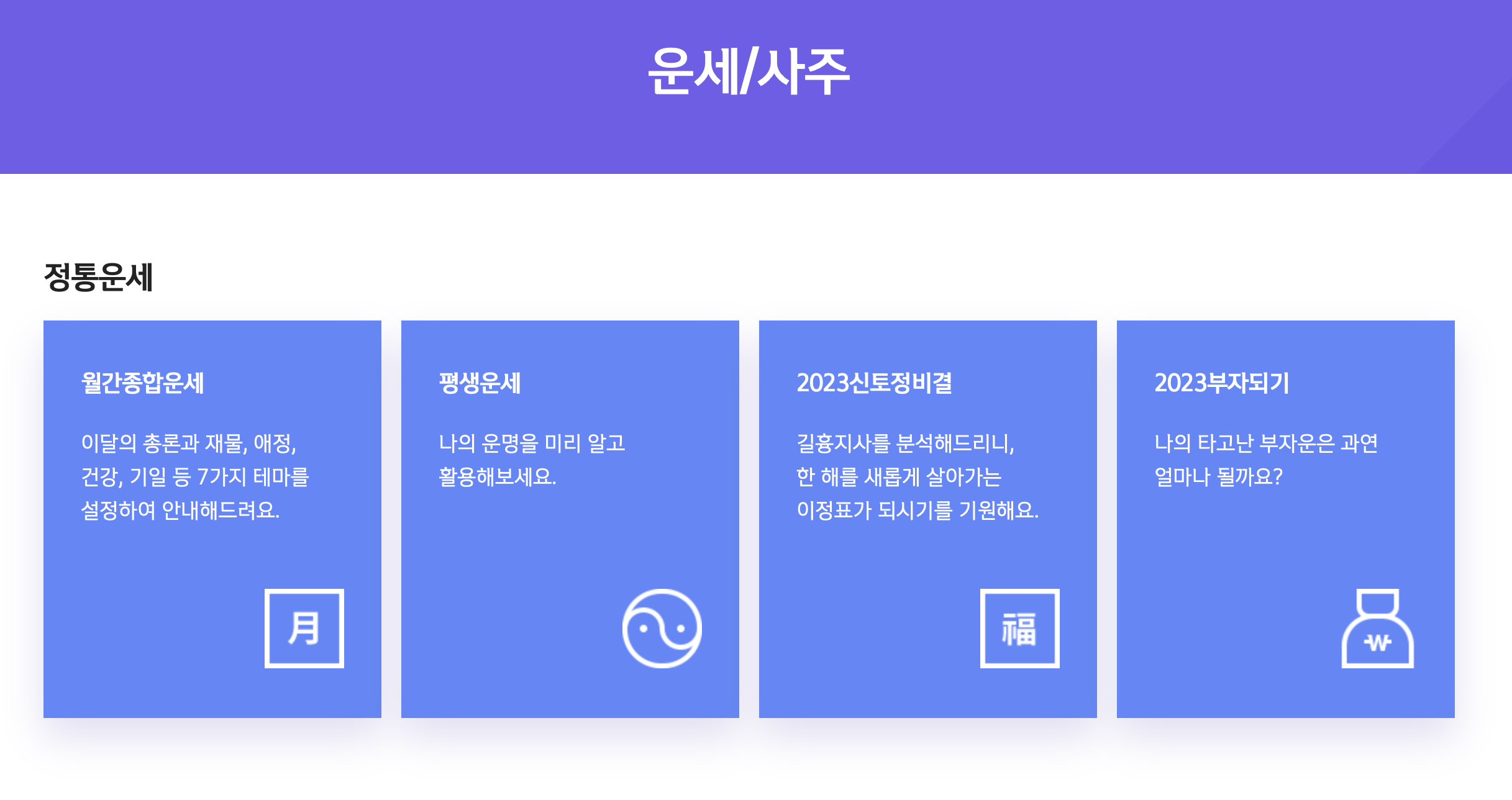신한생명 무료 사주풀이는 별도의 회원가입 없이 무료로 볼 수 있으며, 신뢰도가 높아 오래전부터 많은 사람들이 이용하고 있습니다. 운세/사주 카테고리에서 월간종합운세, 평생운세, 2024 신토정비결, 2024 부자 되기까지 보실 수 있습니다.