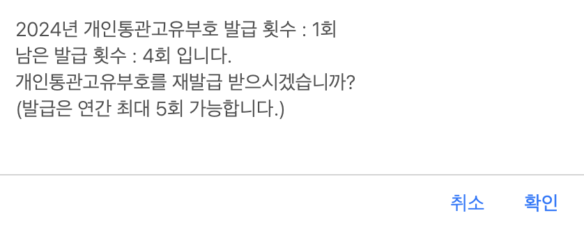 5. 개인통관고유부호 발급은 연간 최대 5회까지 가능합니다. 횟수를 인지하시고, 필요에 따라 재발급받으시면 되겠습니다.