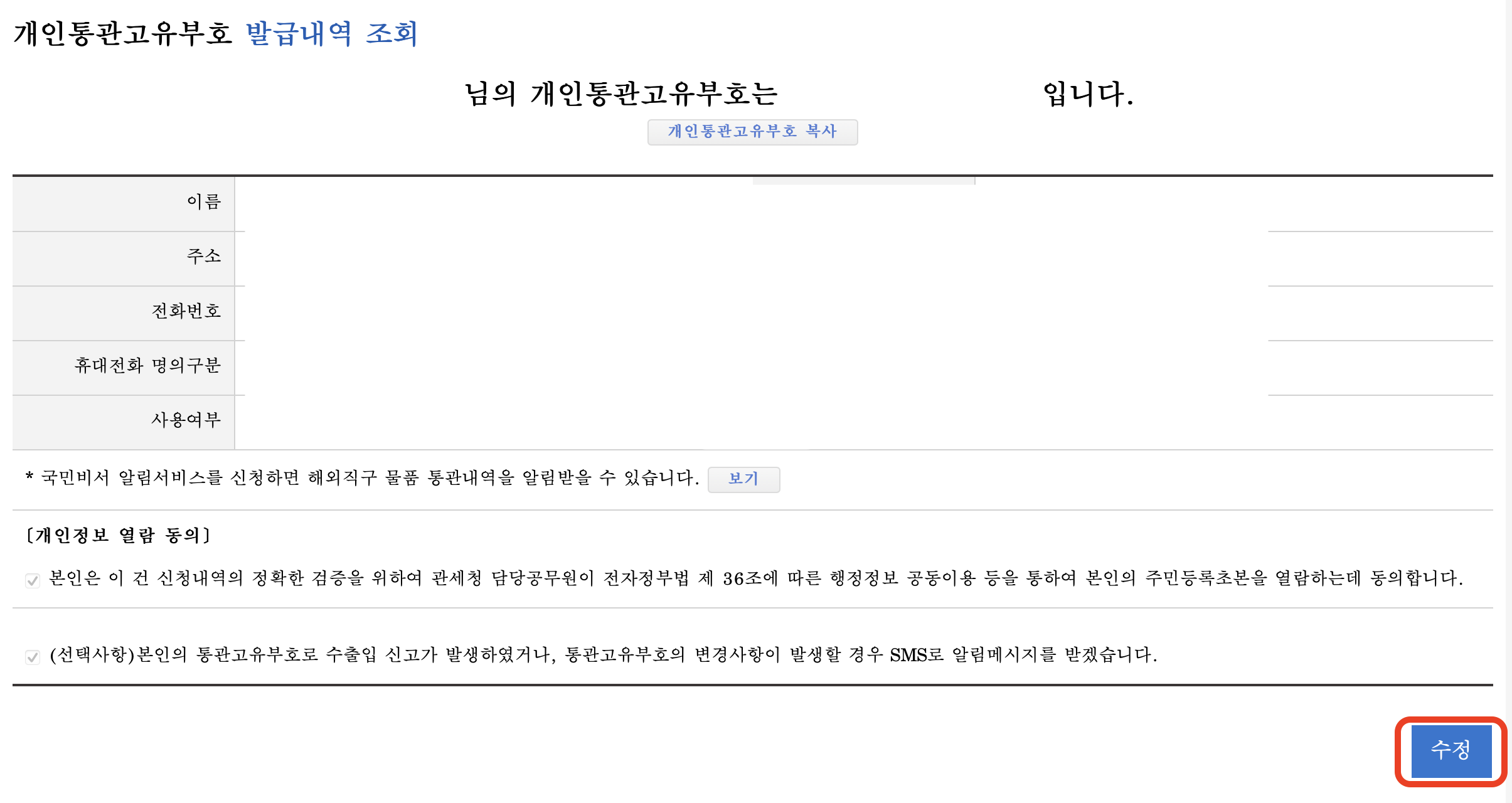 3. 개인통관고유부호 발급내역 조회를 통해서 내 고유번호를 확인하실 수 있습니다. 이 화면에서 우측 하단의 수정을 선택하시면 됩니다.